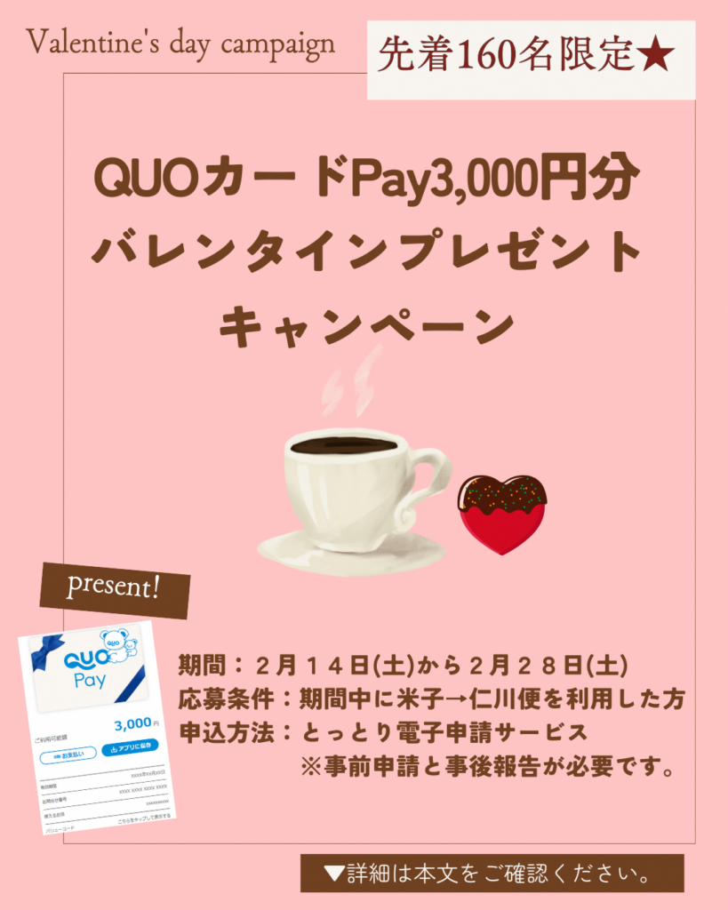 対象期間に米子ソウル便を利用した方へ、QUOカードPay3,000円分をバレンタインプレゼント!