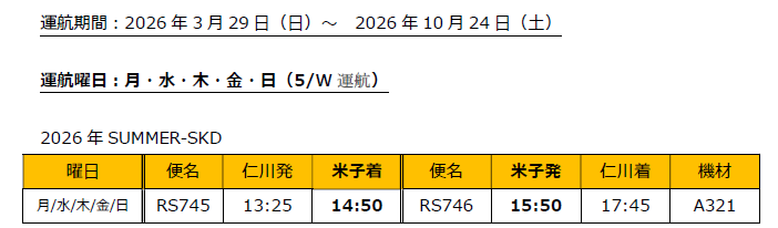 2026.02.24 ソウル便 エアソウル 米子-仁川定期便 2026年SUMMER運航スケジュールのご案内 エアソウル 米子-仁川定期便 2026年SUMMER運航スケジュールは下記の通りです。 一覧に戻る